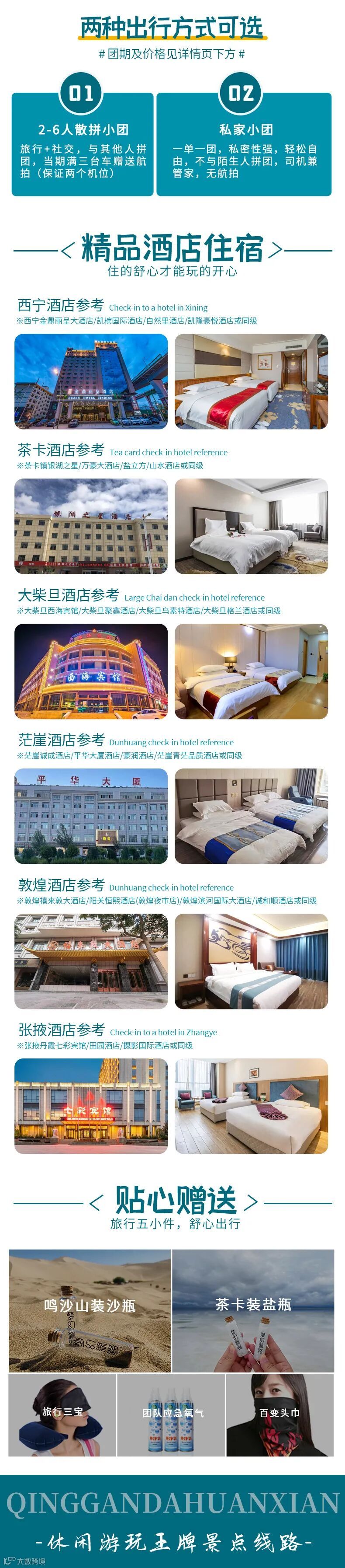 1、住宿:西宁商务型酒店标间1晚、茶卡镇舒适型酒店标间1晚、大柴旦舒适型酒店标间1晚、茫崖市舒适型酒店标间2晚、 敦煌沙漠帐篷露营1晚(公卫无浴,也可替换住商务型酒店双标间)、敦煌商务型酒店标间1晚、临泽/张掖丹霞商务型酒店标间1晚。