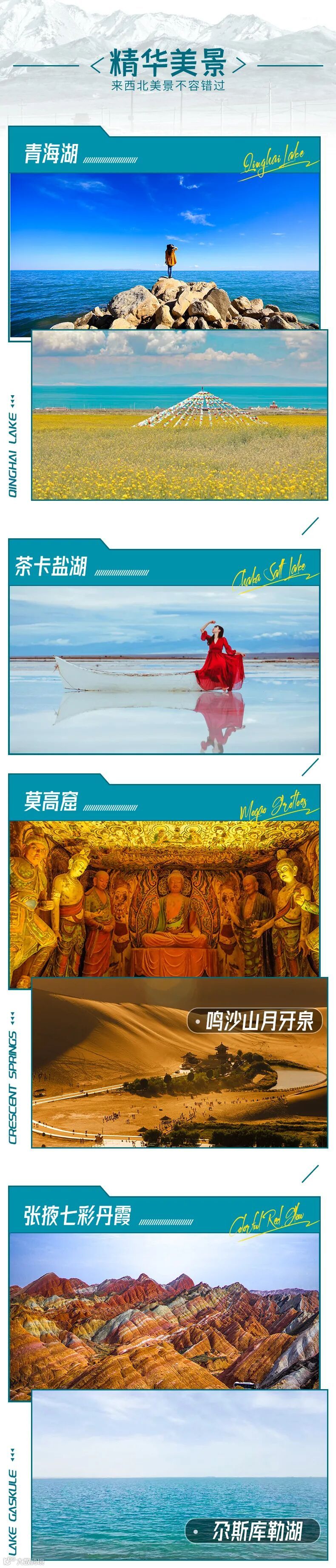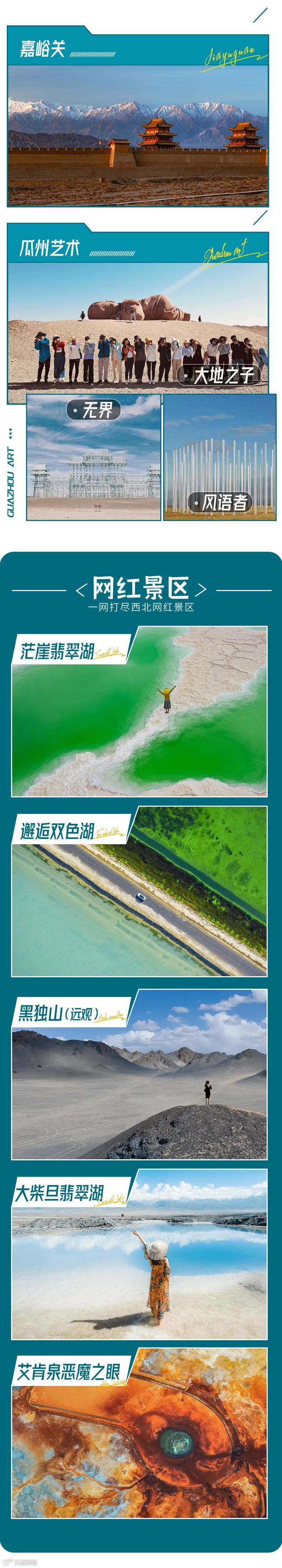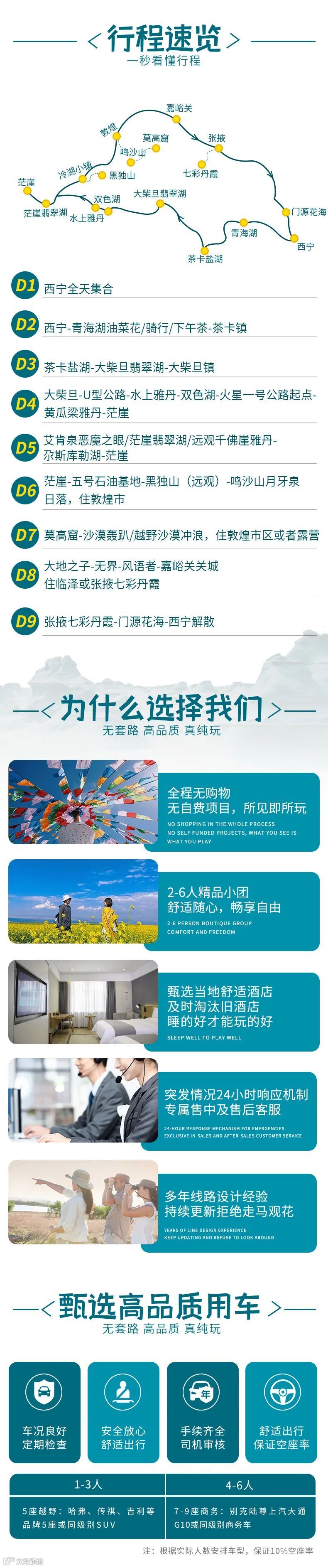4、门票:茶卡盐湖(青海省海西洲是浙江援建,浙江籍游客凭有效证件游览茶卡盐湖可免门票,现场退还门票)、大柴旦翡翠湖门票、水上雅丹门票+环保车、茫崖翡翠湖卫生费、艾肯泉卫生费、莫高窟、鸣沙山月牙泉、嘉峪关关城、七彩丹霞+环保车