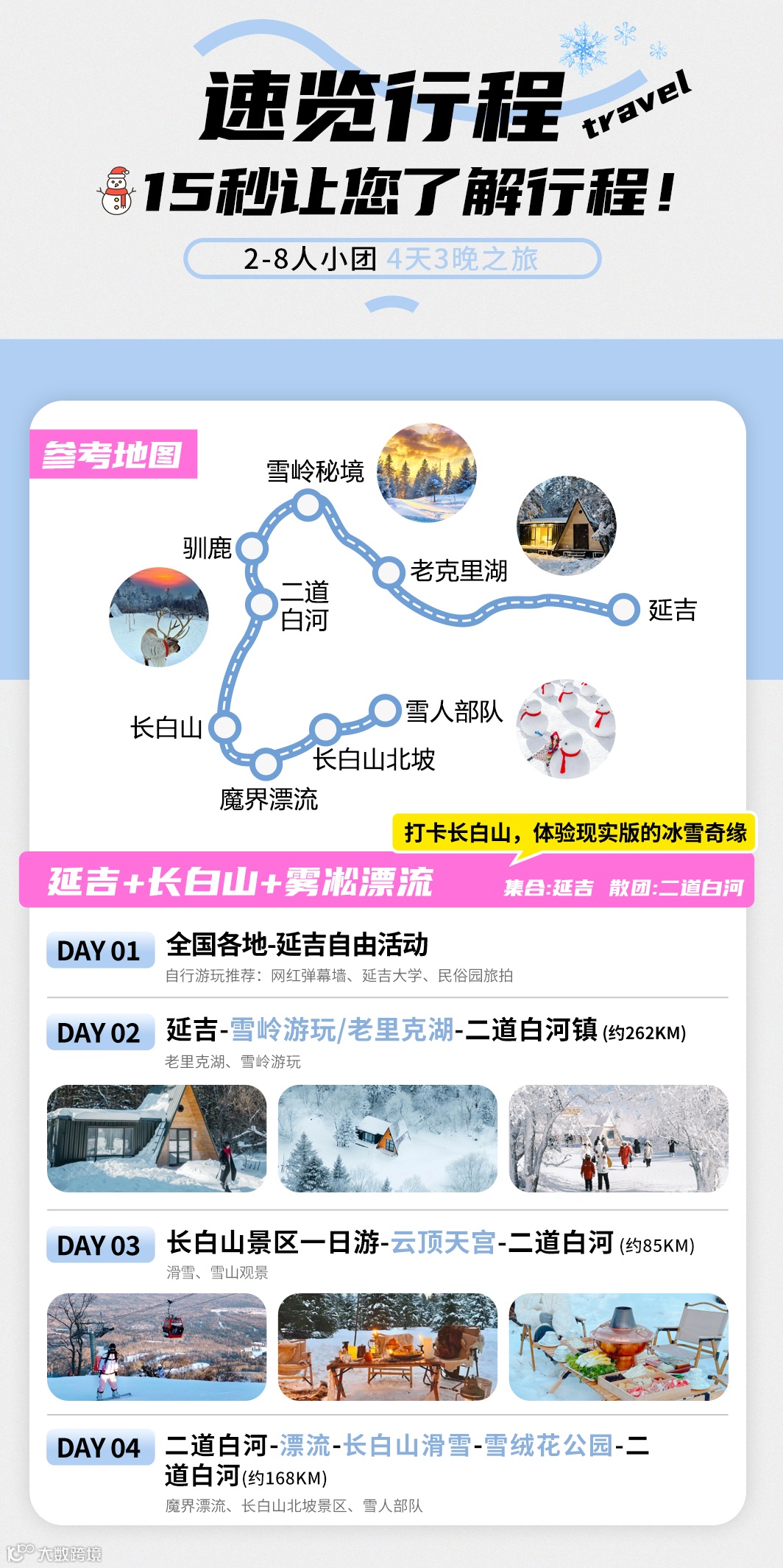 二道白河--漂流--长白山滑雪--雪绒花公园--二道白河 |