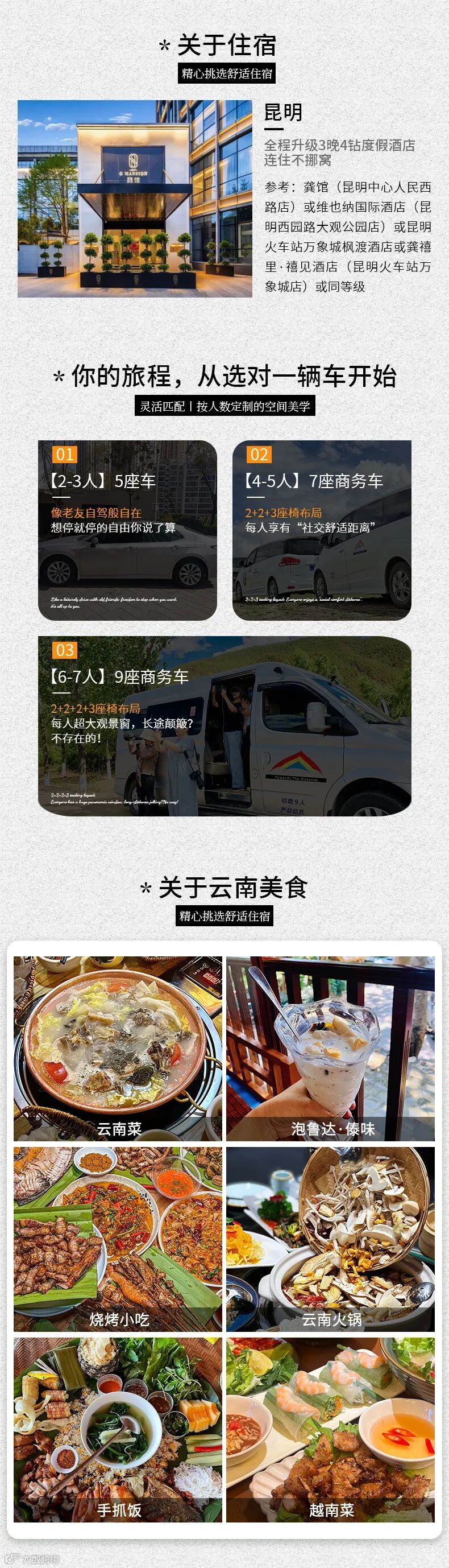 1、住宿:昆明3晚四钻酒店(参考:龚馆(昆明中心人民西路店)或枫渡酒店(昆明火车站万象城店)或龚禧里·禧见酒店(昆明火车站万象城店)或维也纳国际酒店(昆明西园路大观公园店)或同等级);