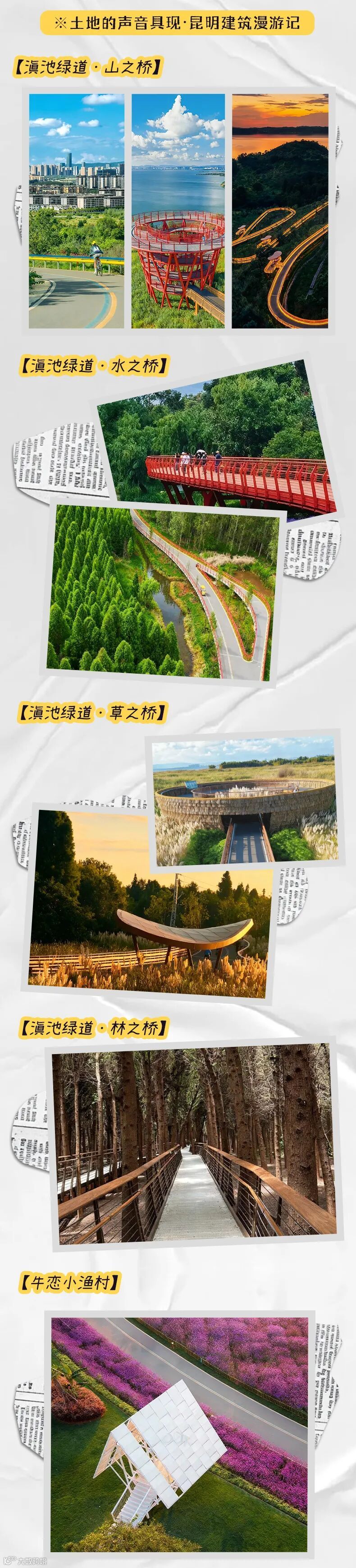 15:30 抵达【山之桥】,不以跨越为终点,而以框景为使命。桥体简洁的线条将西山“睡美人”的轮廓与滇池烟波裁成一幅动态长卷,行走其上,仿佛步入山水画的留白处。/15:30 抵达【林之桥】,穿梭于密林浓荫的光影剧场。桥面树影斑驳,栏杆缠绕藤蔓,鸟鸣与风吟代替了城市噪音,让每一次穿行都变成沉浸自然的森林疗愈。/15:30 抵达【草之桥】,木栈道如缎带飘浮于湿地之上,引导你深入芦苇荡的迷宫。白鹭在身旁觅食,水生植物在脚下摇曳——这座桥是人与湖岸生态最诗意的对话。/15:30 抵达【水之桥】,仿佛直接铺陈于滇池波光之上。低平的桥身消隐了边界,行走时如凌波微步,晴日看云朵倒映,雨时观涟漪圈圈,成就最亲近水面的冥想时刻。