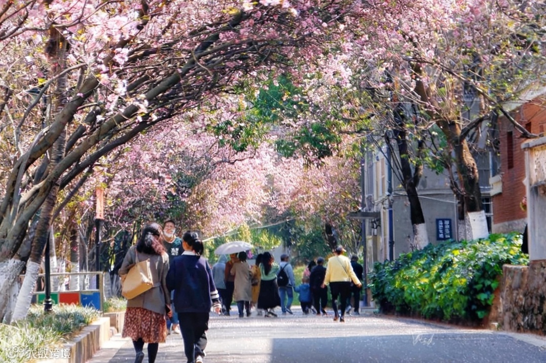 14:30 抵达【官渡古镇·冬樱花】,唐代金刚塔披上粉纱,明时孔庙泮池浮满樱瓣。奶茶杯与香火烟在花枝下交错,彝族绣娘坐在樱花雨里穿刺银饰。忽有钟声撞碎光影,六百岁的古镇眨了眨眼,将春信藏进飞檐斗拱的每一道褶痕。/14:30 抵达【世博园·冬樱花】,当初雪还未降临,世博园的冬樱花已抢先奏响春之序曲。粉嫩花朵在冬日蓝天下簇拥绽放,与园内各国展馆的异域风情构成奇妙对话。漫步花径,风过时落下一场温柔花雨,这里是冬日昆明最治愈的粉色秘境。
