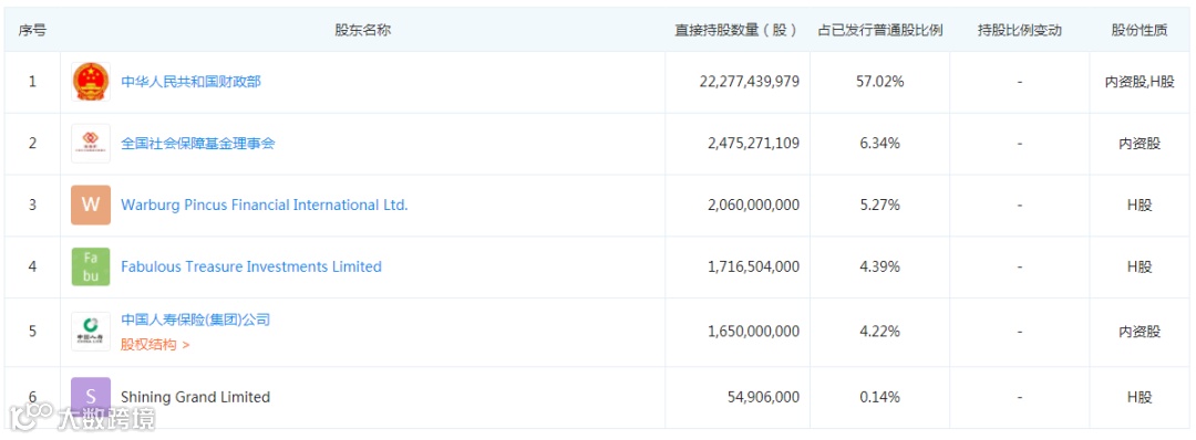 中国华融也一样,它最大的股东是中国财政部,占比57%,社保基金是它的二股东,占比6%。