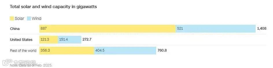 根据全球能源监测组织数据,中国目前正在建设510吉瓦的公用事业规模太阳能和风能容量,加上已并网的1400吉瓦(相当于美国总量的5倍),对美国形成碾压性优势。
