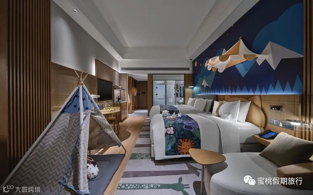 陵水碧桂园希尔顿逸林温泉酒店拥有6间亲子家庭客房大床加小床,使用面积超42㎡,家庭房有两种亲子主题布置,并配备有各种卡通墙贴,儿童洗漱用品,拖鞋,浴袍,帐篷等,房间配有1张大床及一张儿童主题床。