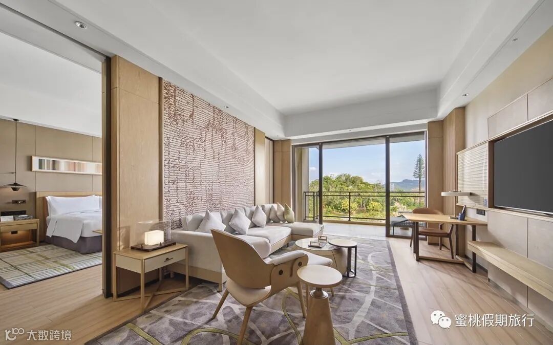陵水碧桂园希尔顿逸林温泉酒店拥有138间逸林客房,使用面积超40㎡,独立阳台及落地窗,能最大限度引景入室,阳台配备躺椅沙发,小茶几,所有房间朝向均坐南朝北,可静静仰躺在阳台上独揽热带园林及山丘景色。