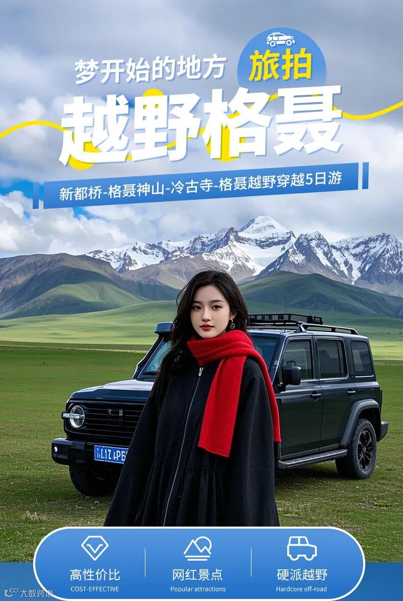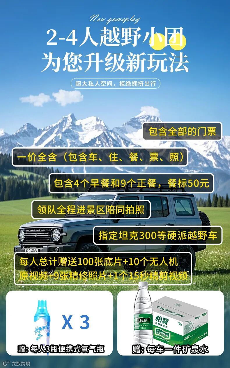 1、交通:成都出发往返交通费用(一人一座),每车不超过4位游客(坦克300、BJ40、捷途旅行者等硬派越野车);
