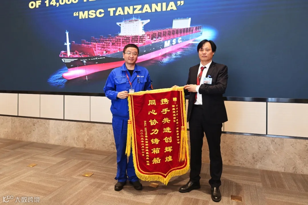 建造团队在交船当日还收到了来自船东监造组的锦旗——携手共进创辉煌,同心协力铸箱船。