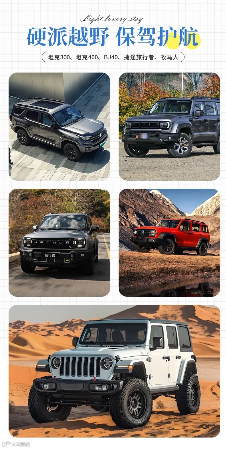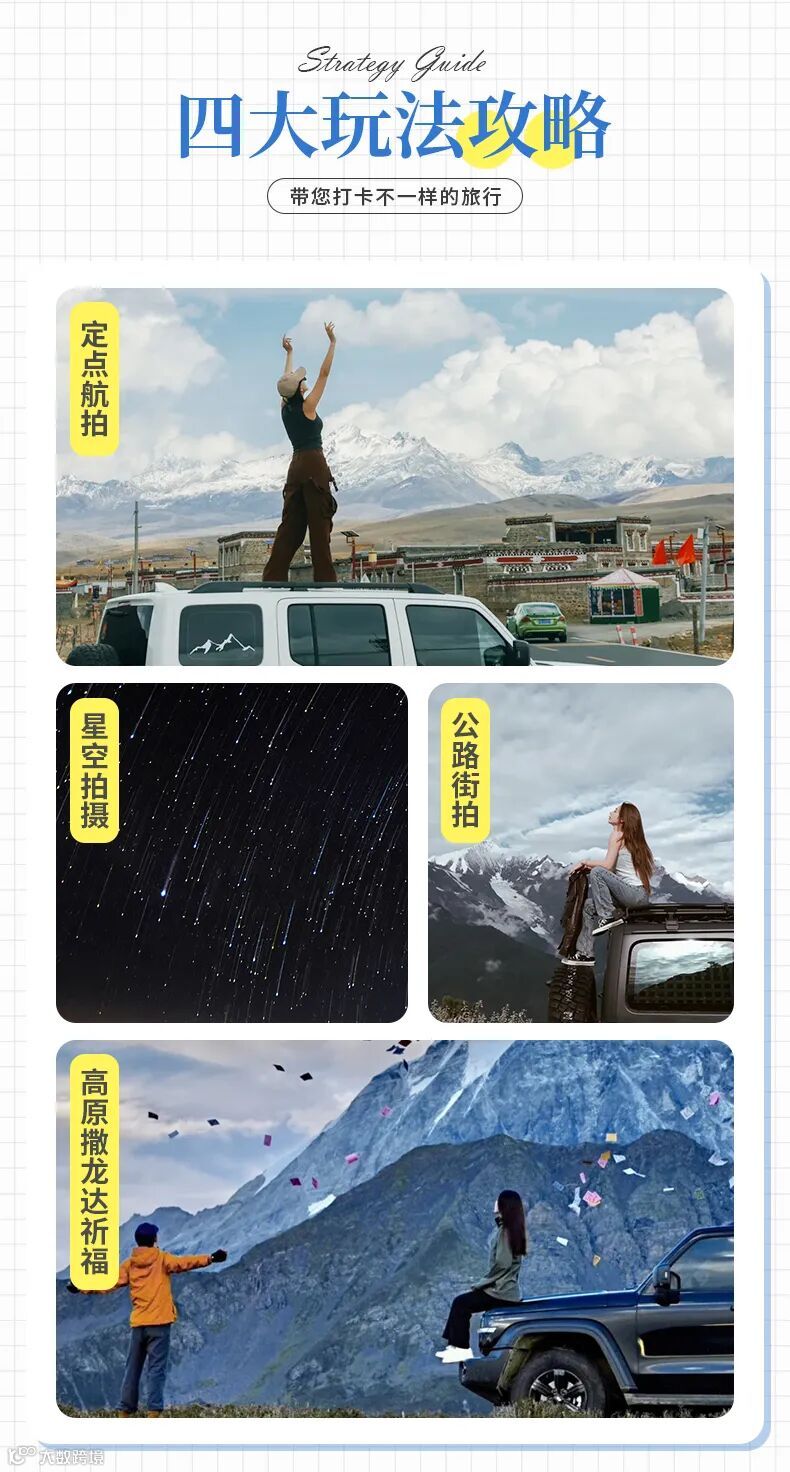 1、交通:成都出发往返交通费用(一人一座),每车不超过4位游客(坦克300、BJ40、捷途旅行者等硬派越野车);