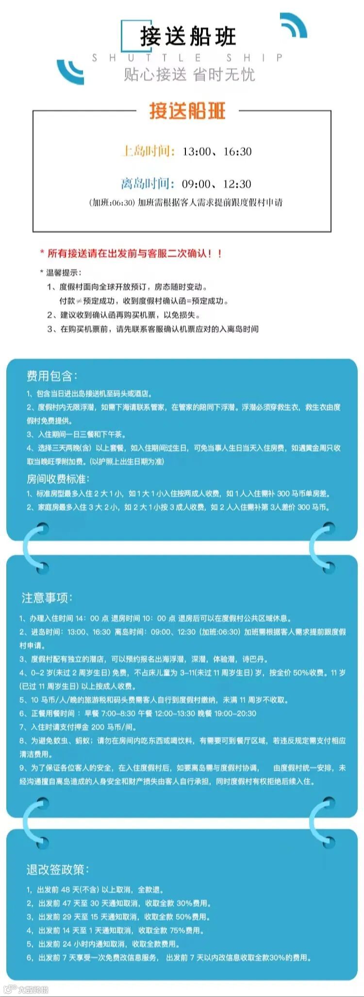离岛时间:09:00/12:30(加班06:30)加班需根据客人需求提前跟度假村申请、