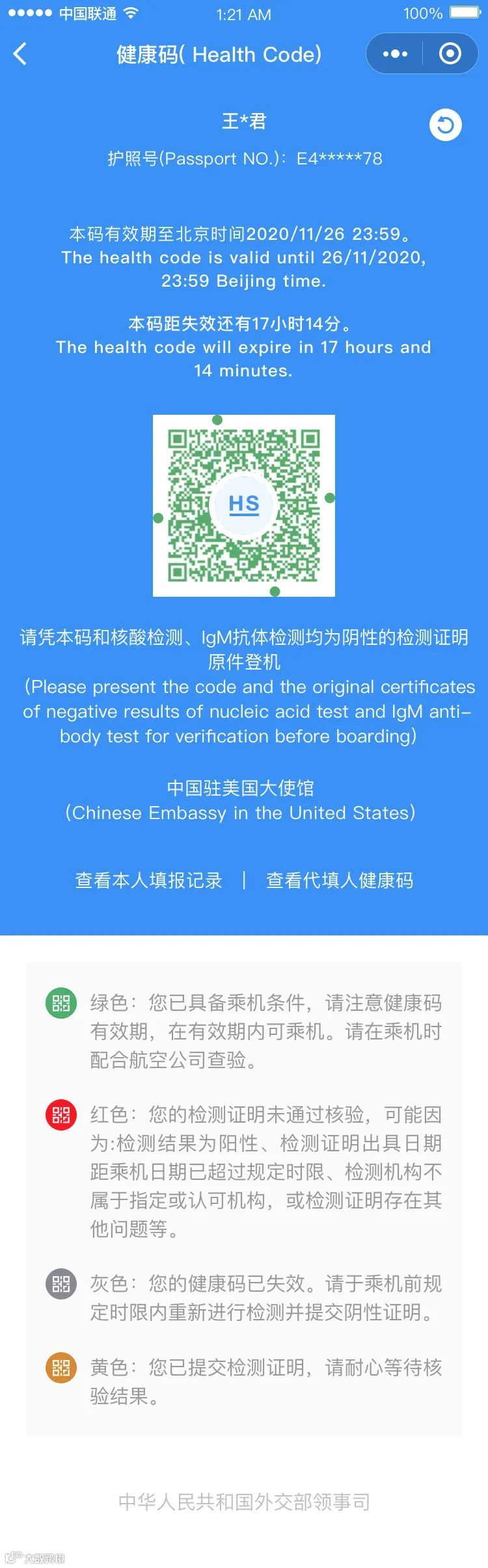 即只有持有中国驻海外领事馆发放的新型肺炎检测“HS”或“HDC”标识的绿色健康码的乘客才能登机。