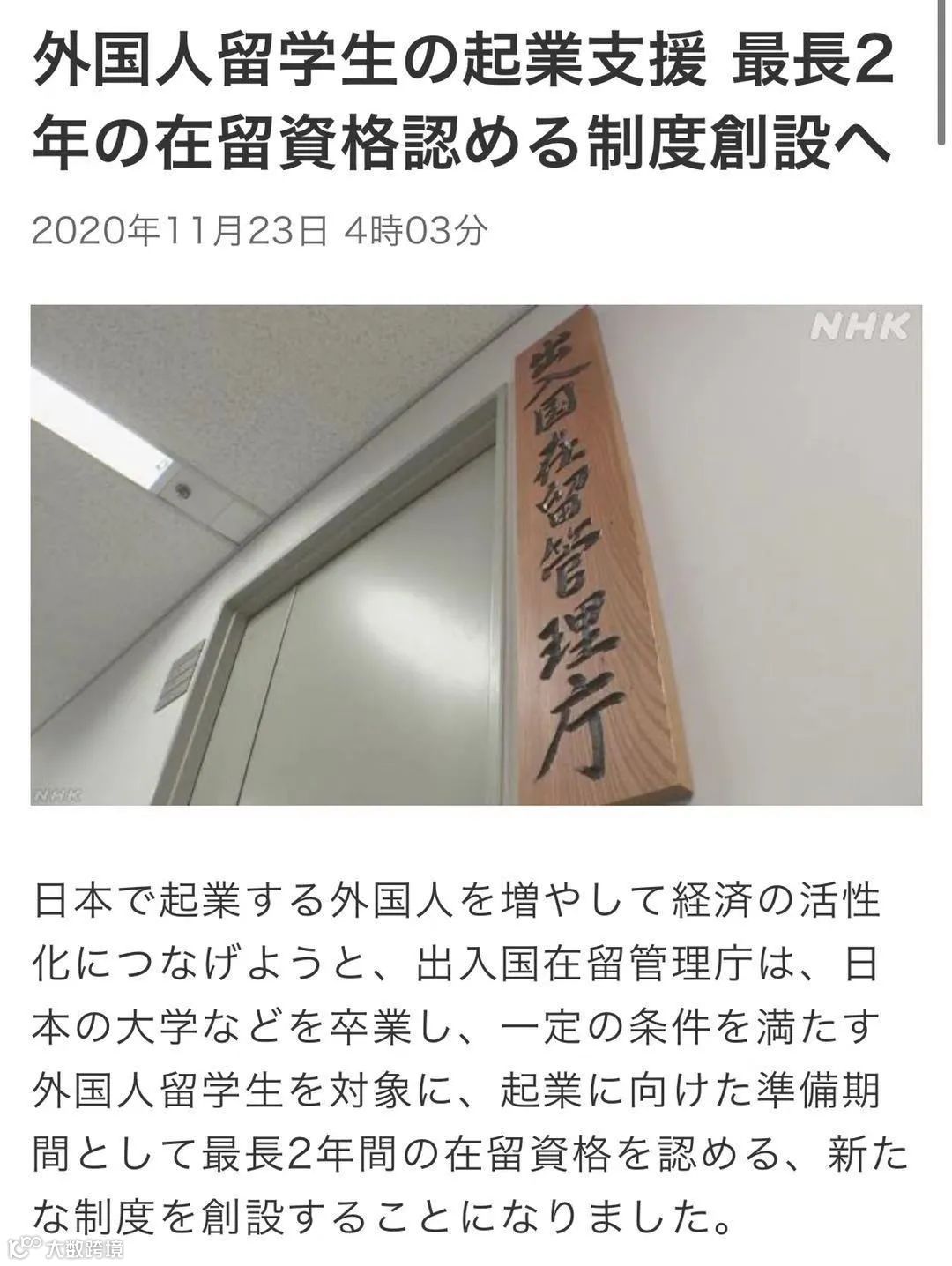 11月20日,日本出入境在留管理局宣布,为了鼓励更多的外国人在日本创业,给日本经济带来活力,决定放宽外国留学生的签证延长制度。
