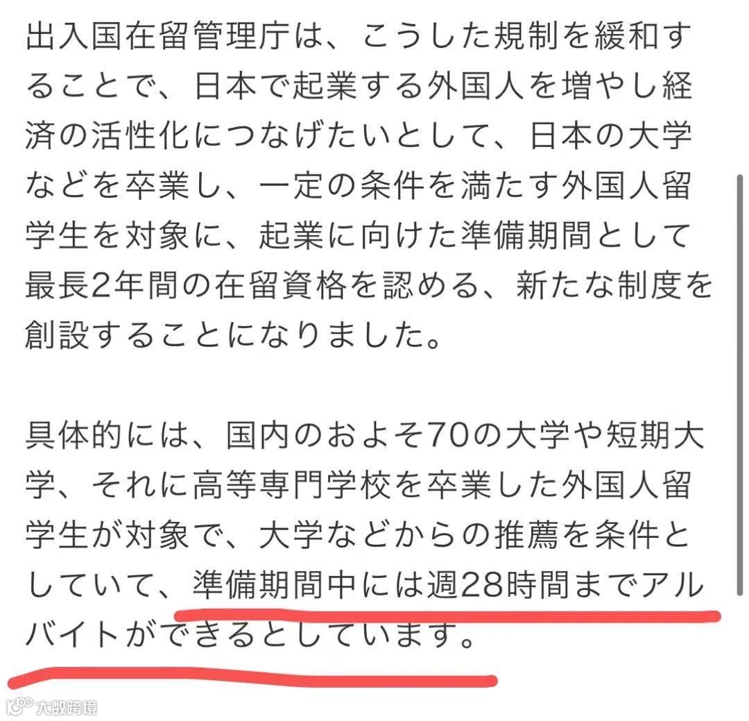 在日本大学毕业并满足一定条件的外国留学生毕业后可以以创业准备为由,申请为期最长2年的特定活动在留资格。而且在为期2年的创业准备时间内,可!以!打!工!(每周打工合计时间在28小时以内)
