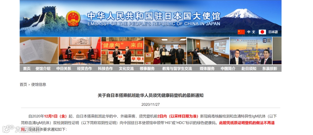 根据中国驻日本大使馆的通知,自2020年12月1日(含)起,自日本搭乘航班赴华的中、外籍乘客,须凭登机前2日内(以采样日期为准)新冠病毒核酸检测和血清特异性IgM抗体的双检测阴性证明向中国驻日本使领馆申领带“HS”或“HDC”标识的绿色健康码。此前凭纸质证明登机的做法不再适用。