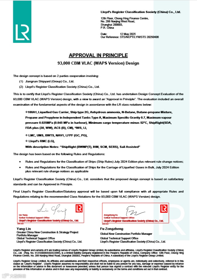 江南造船93K VLAC船型转子风筒节能技术应用获LR船级社AIP认证证书