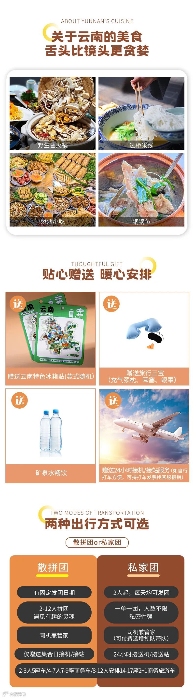 3、用车:2-3人安排5座车,4-5人安排7座商务车,6-7人安排9座商务车,8-12人安排14-17座2+1旅游车;