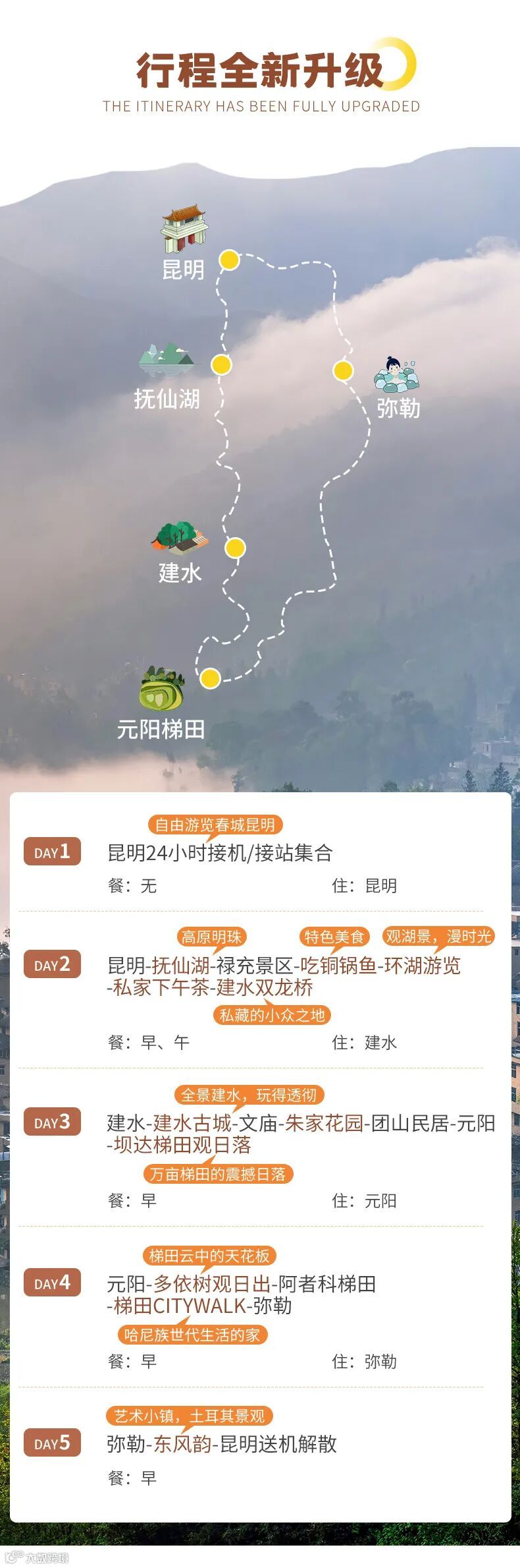 4、门票:抚仙湖禄充景区,下午茶,建水文庙,朱家花园,团山民居,元阳景区,阿者科民俗村,东风韵景区;
