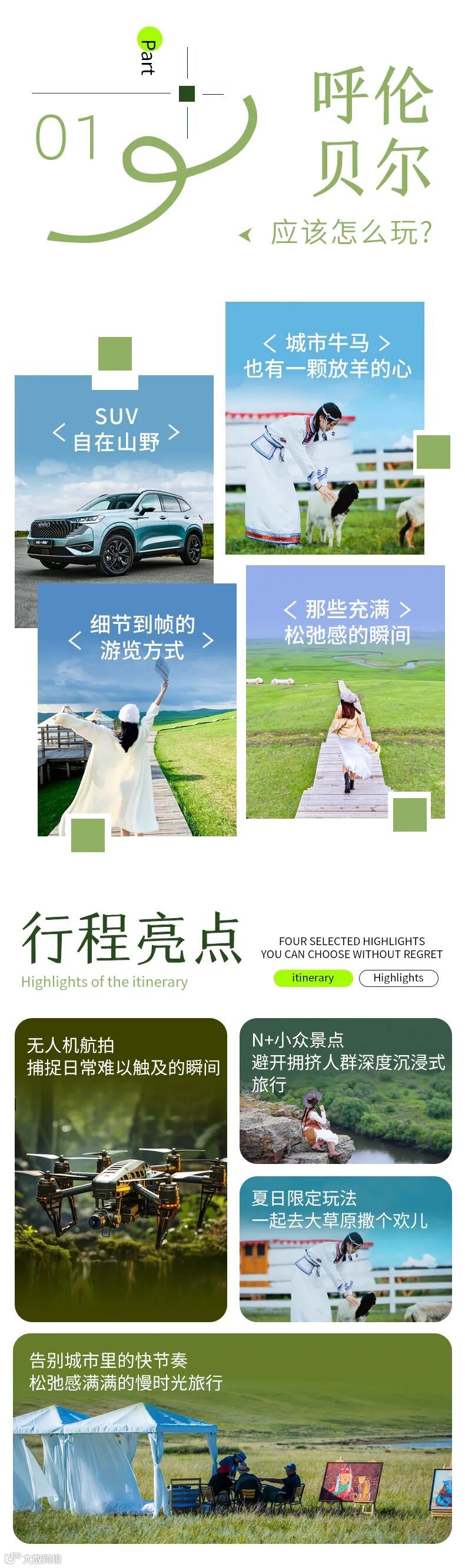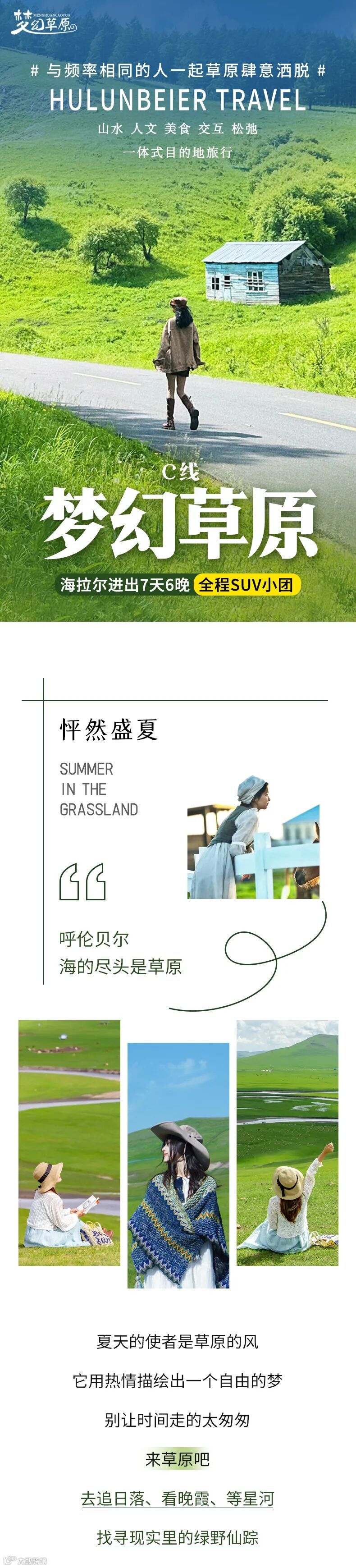 2. 穿戴:草原早晚温差较大,早晚较凉,中午又比较热;白天温度可以参考出行前的天气预报,但是建议根据出行季节携带薄/厚外套,以抗风冲锋衣软壳系列为佳;夏季带正常夏装,春秋带长衣长袖或者冰袖,最好穿长裤避免晒伤;骑马的时候推荐牛仔裤耐磨或者紧身长裤,鞋子以舒适运动鞋/户外登山鞋为主。不知道穿啥,白色肯定不会错,低饱和浅色系列:白、米、蓝、黄、红、绿、咖啡色,都很出片。