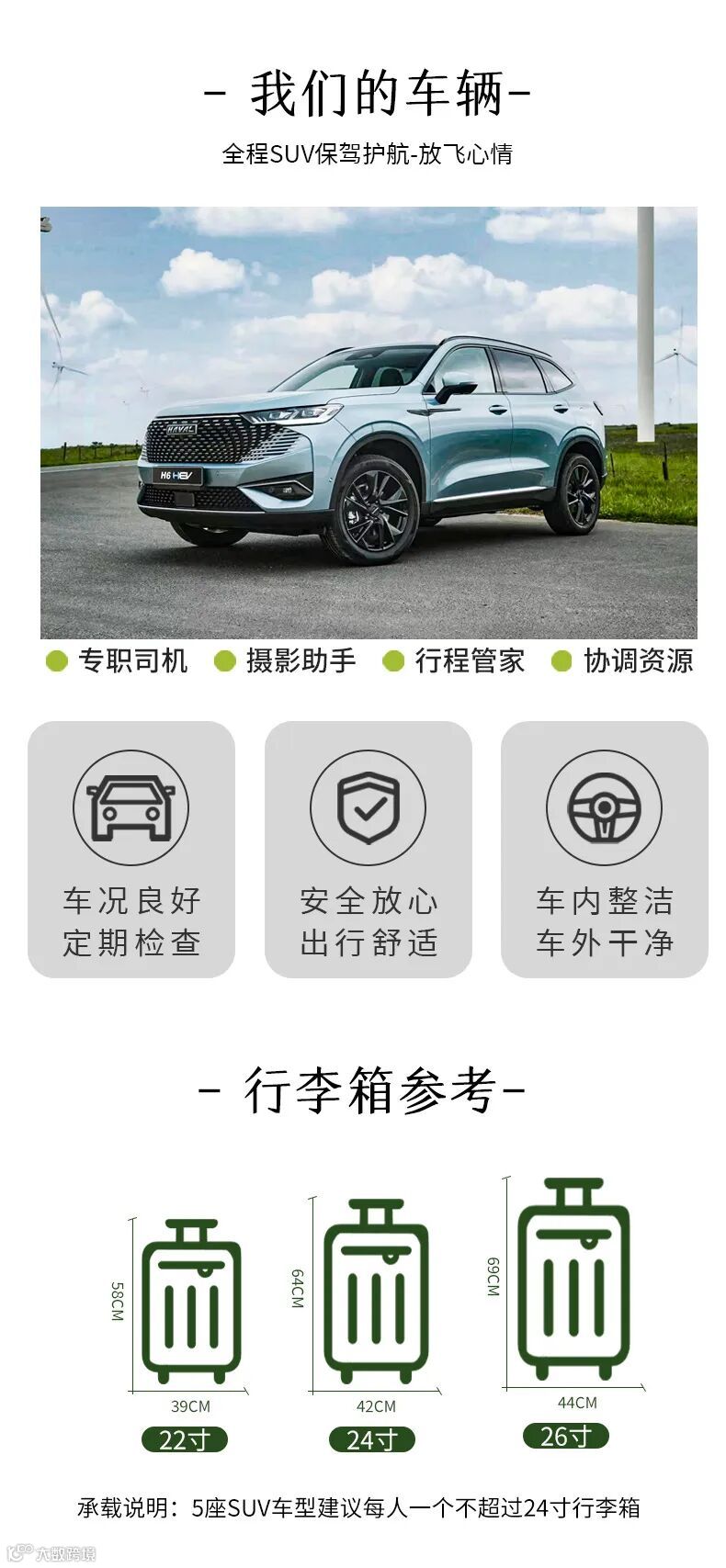 4、请每人携带24寸以下行李箱一个,如超出范围可能造成无法放进车辆后备箱,望悉知