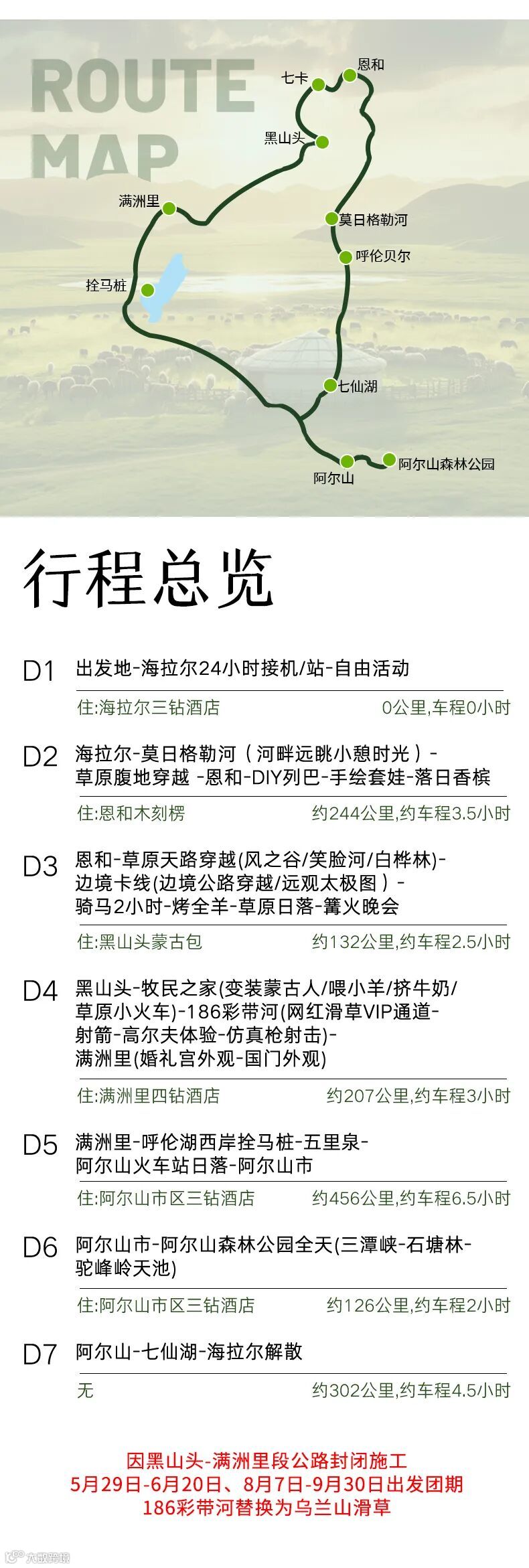 2、呼伦湖西岸拴马桩为小众秘境为非收费景点,如遇恶劣天气或政府原因封路等情况则会舍弃该点,不退费用,敬请谅解。
