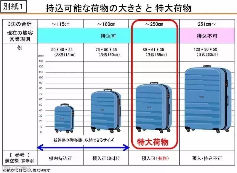 从2020年5月起,携带大件行李乘坐新干线没有提前预约的话,需要额外支付1000日元(约67元)的“行李税”。所谓大件行李是长宽高三边长度总和大于160cm(28寸)且不超过250mm的行李箱,251cm及以上的行李箱是不可携带上新干线的。
