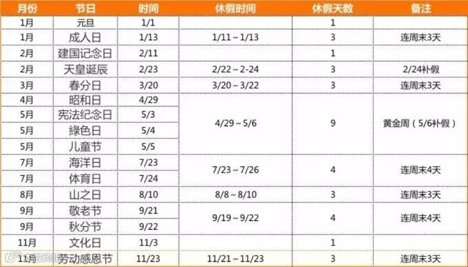 为了配合2020年东京奥运会,日本今年的海洋日、体育日和周末一起连休4天,敬老节和秋分节也和周末一起形成了4连休。