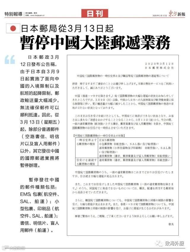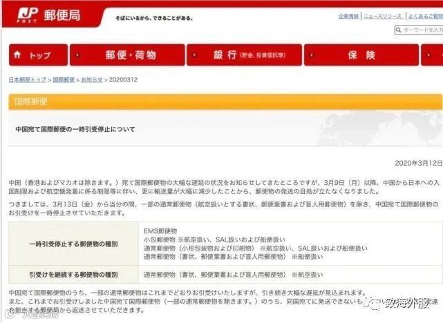 日本邮局自2020年3月13日,日本邮政停止接受发往中国的货物(除书信,明信片以及盲人邮件),包括EMS, 航空便,SAL便,船运,全部停止接货。