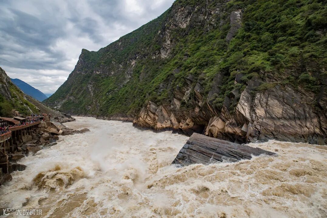 14:00 来到【虎跳峡】,百米峡谷中,礁石林立,犬牙交错,水流湍急,凉涛拍岸,卷起无数雪浪苍烟。江面落差甚大,两岸的悬岩怪石间,生长着阔叶灌木丛,枝繁叶茂,郁郁葱葱,使惊险中又生幽趣。