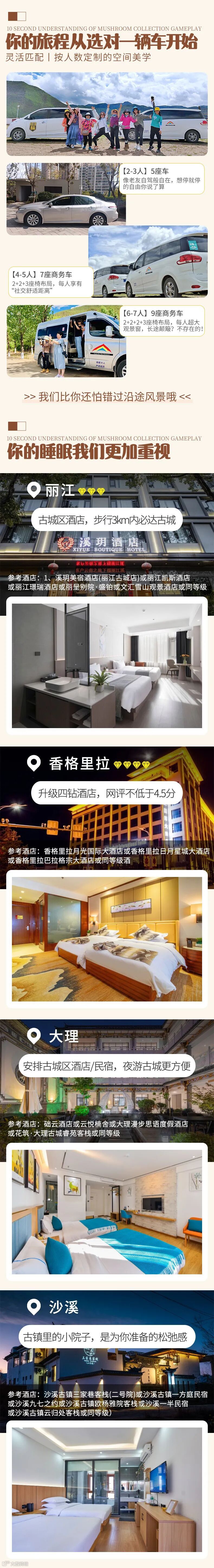 1、住宿:丽江三钻酒店2晚(参考:溪玥美宿酒店(丽江古城店)或丽江凯斯酒店或丽江璟瑞酒店或丽呈别院·盛铂或文汇雪山观景酒店或同等级),大理三钻酒店1晚(参考:础云酒店或云悦楠舍或大理漫步思语度假酒店或花筑·大理古城睿苑客栈或同等级),沙溪二钻/三钻民宿/酒店1晚(参考:沙溪古镇三家巷客栈(二号院)或沙溪古镇一方庭民宿或沙溪九七之约或沙溪古镇欧杨雅院客栈或沙溪一半民宿或沙溪古镇云归处客栈或同等级),香格里拉四钻酒店1晚(