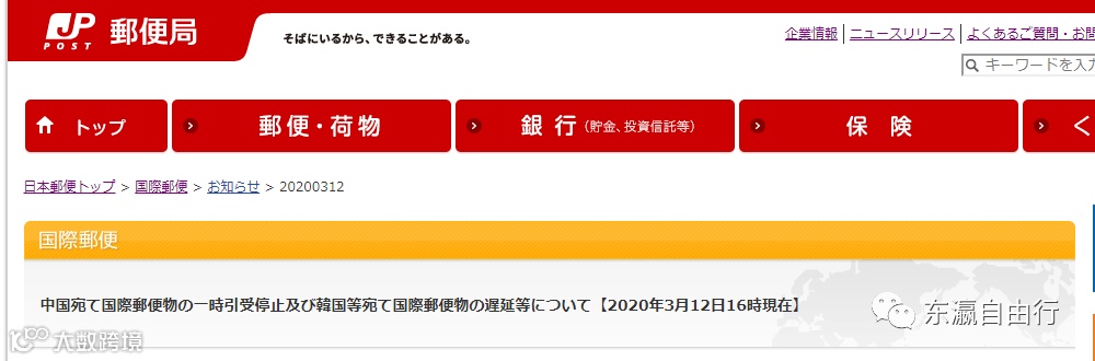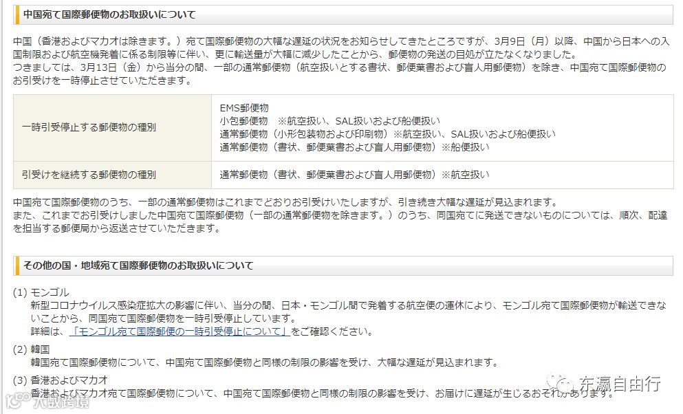 3月12日,日本邮局官网发布消息称,由于新冠肺炎导致中日两国航班大幅度减少,自3月13日起,不得不暂停收取发往中国(不包括中国香港和澳门)的国际EMS邮件。包括: