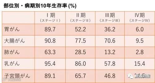 全国癌症中心协会网发表了《各部位各临床病期10年相对生存率(2001 - -2004年)》,文中举例道,如果在胃癌早期(I期)时,就能发现并接受治疗,9成左右的人能够生存10年以上,而如果是发展中的III期(StageIII),10年生存率下降至约3成, 到了IV期100人只有6人能有幸活下来。