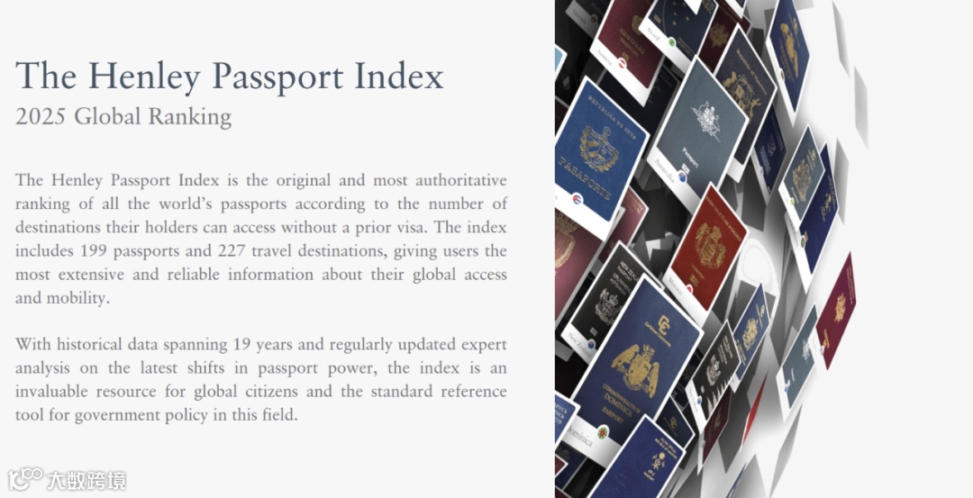 Henley护照指数是一份原创的权威排名,根据护照持有人免签即可前往的目的地数量对全球所有护照进行排名。该指数基于国际航空运输协会 (IATA)的独家数据(该协会是全球最大、最准确的旅行信息数据库),并由 Henley & Partners 的研究团队进行了改进。