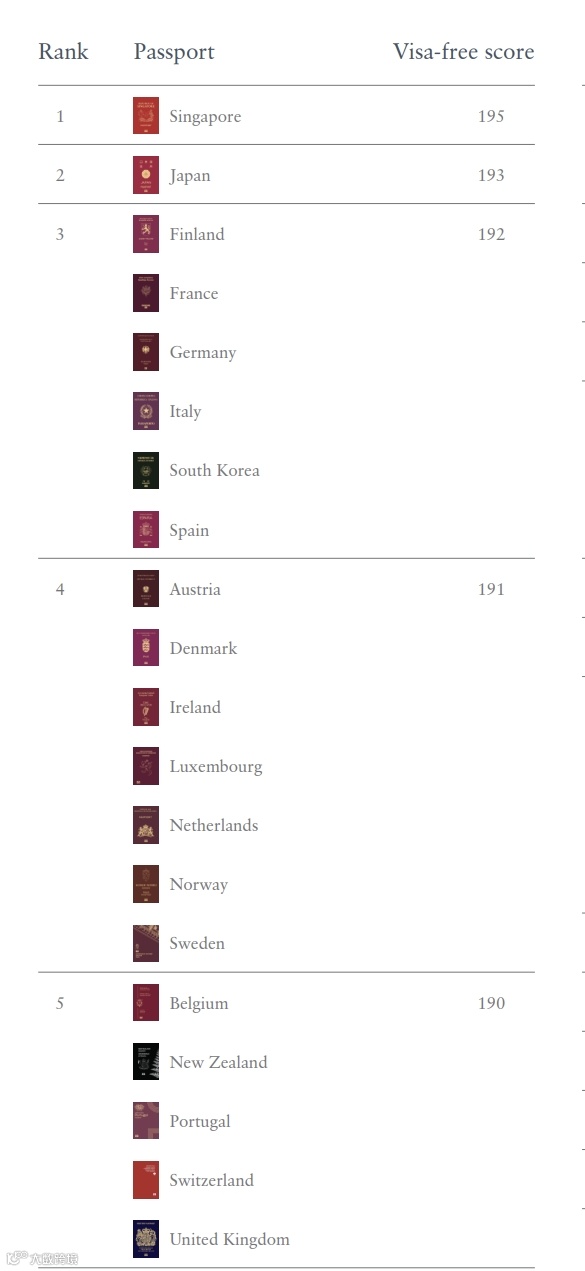法国、德国、意大利和西班牙等欧盟国家,以及芬兰和韩国并列第3,这些国家的公民可免签前往192个目的地。