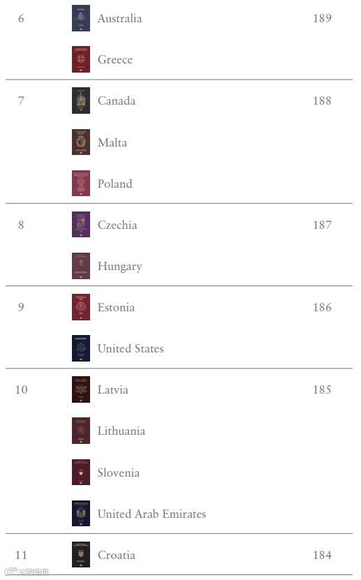 加拿大排名第7,与波兰和地中海岛国马耳他并列,共享188个国家和地区的免签待遇,加拿大排名与去年相同。