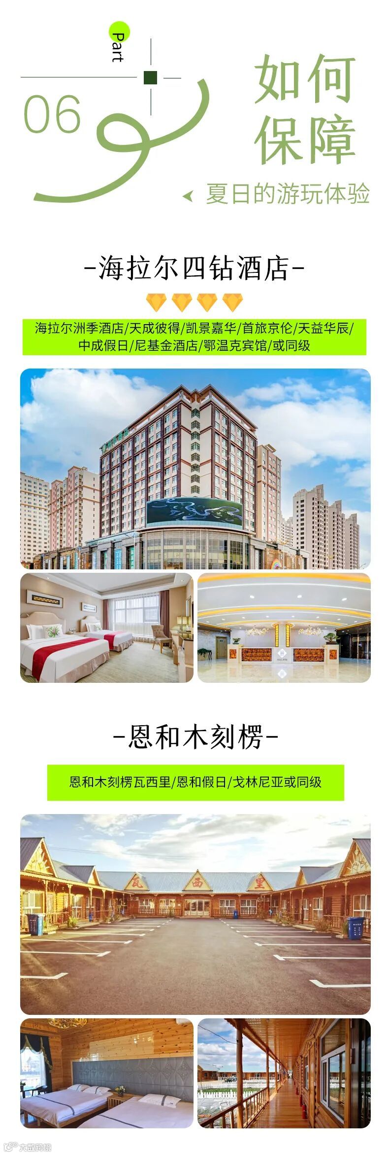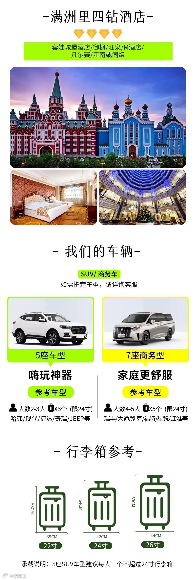 1.2米及以下为儿童,免门票、免早餐、含车位、含保险、含赠送项目,不占床位,超高但未满12周岁需补半价门票100元+早餐费240元,如需占床补1400元床位费含早餐 升级轻奢版补差价2000元/人 海拉尔参考百府悦或同级 恩和参考哈乌尔或同级 满洲里参考套娃/香格里拉或同级 |