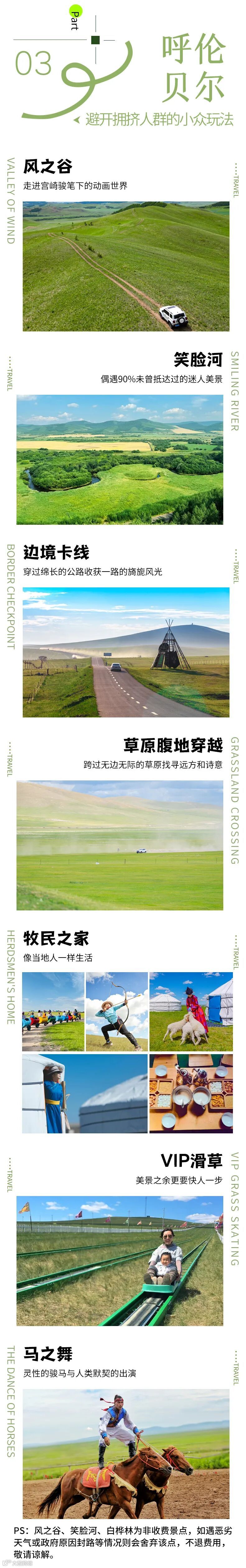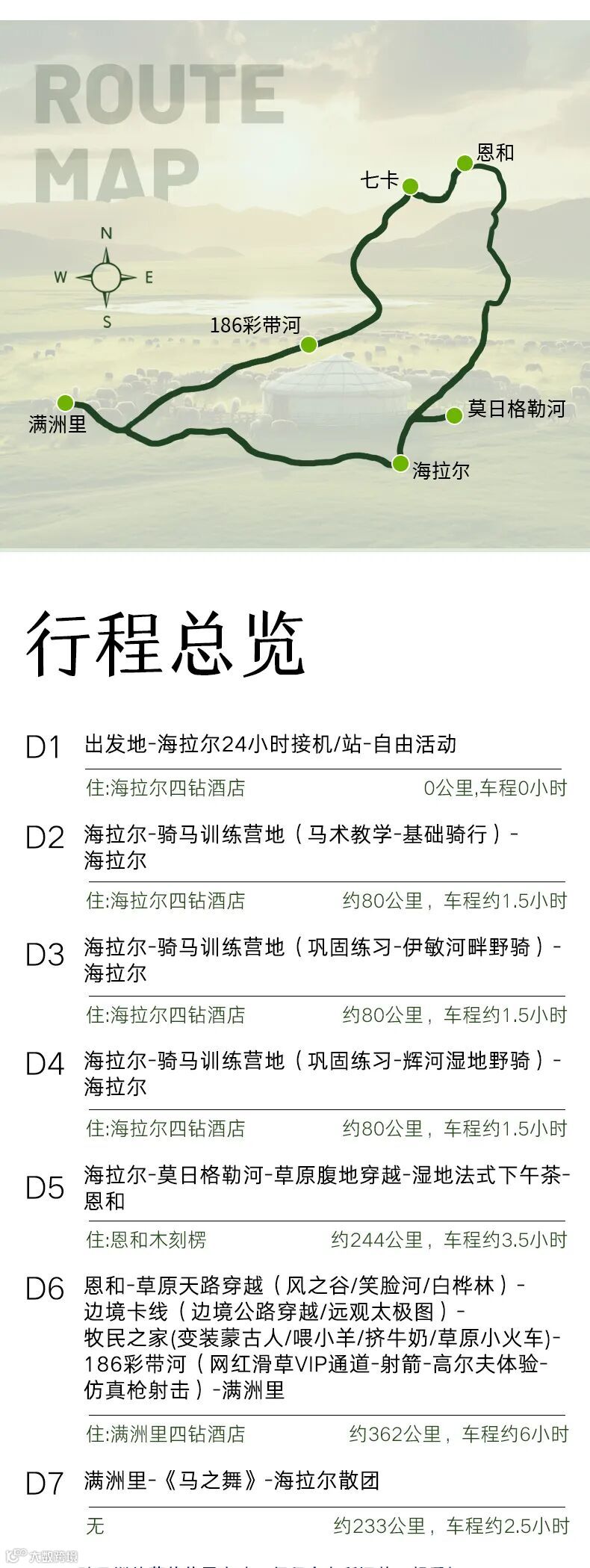 恩和-草原天路穿越(风之谷/笑脸河/白桦林)-边境公路穿越-186彩带河VIP滑草(185KM,车程约3小时)-满洲里(152KM,车程约2小时)-满洲里