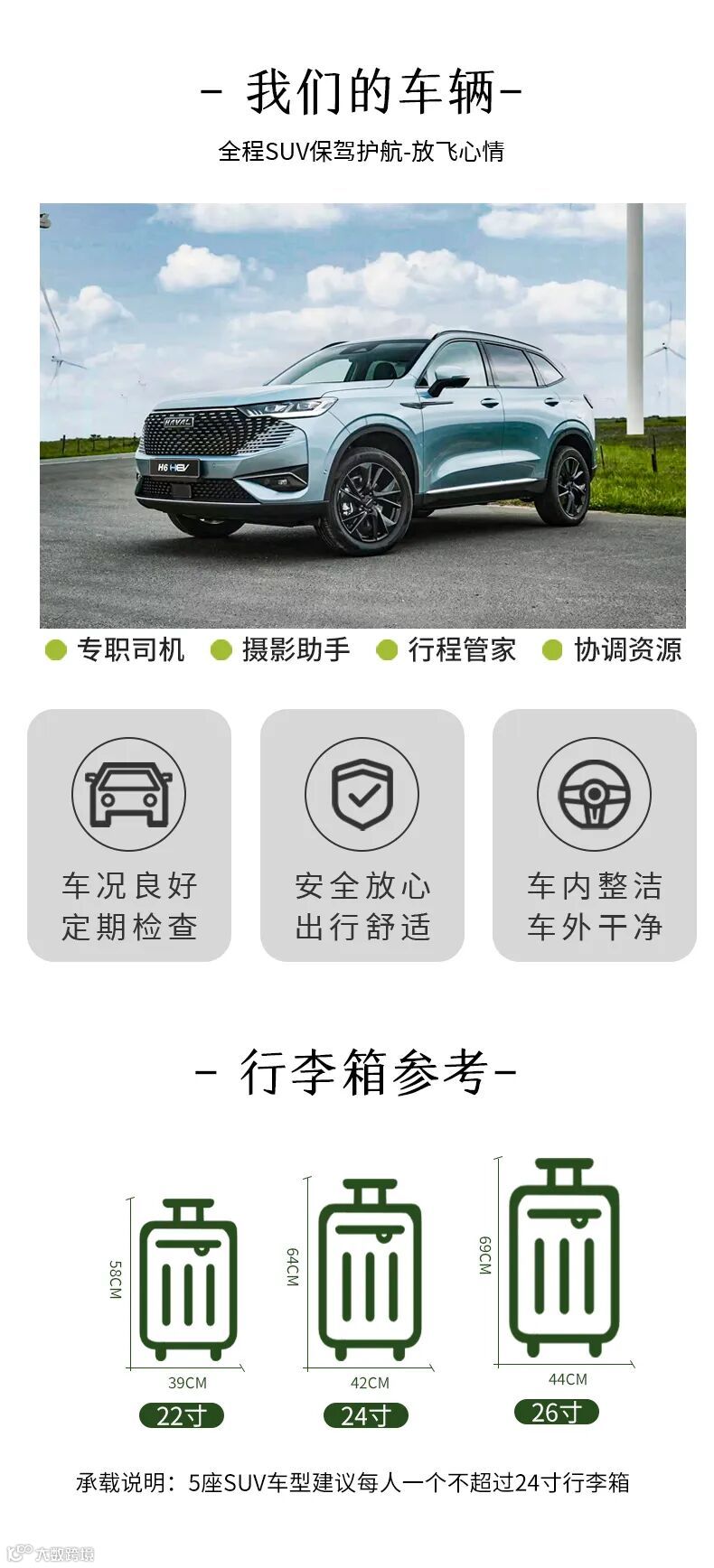 3、用车:全程SUV,4人一车(尽量安排同组一车,有特殊情况保留座位调配权利);