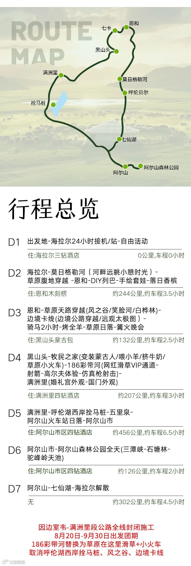 阿尔山-七仙湖-海拉尔(360KM,约5小时)