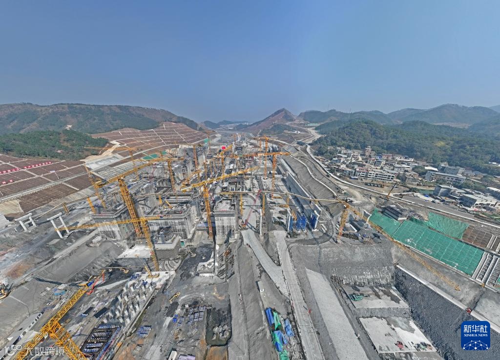 广西钦州市灵山县旧州镇的平陆运河马道枢纽建设现场(今年1月无人机拍摄)