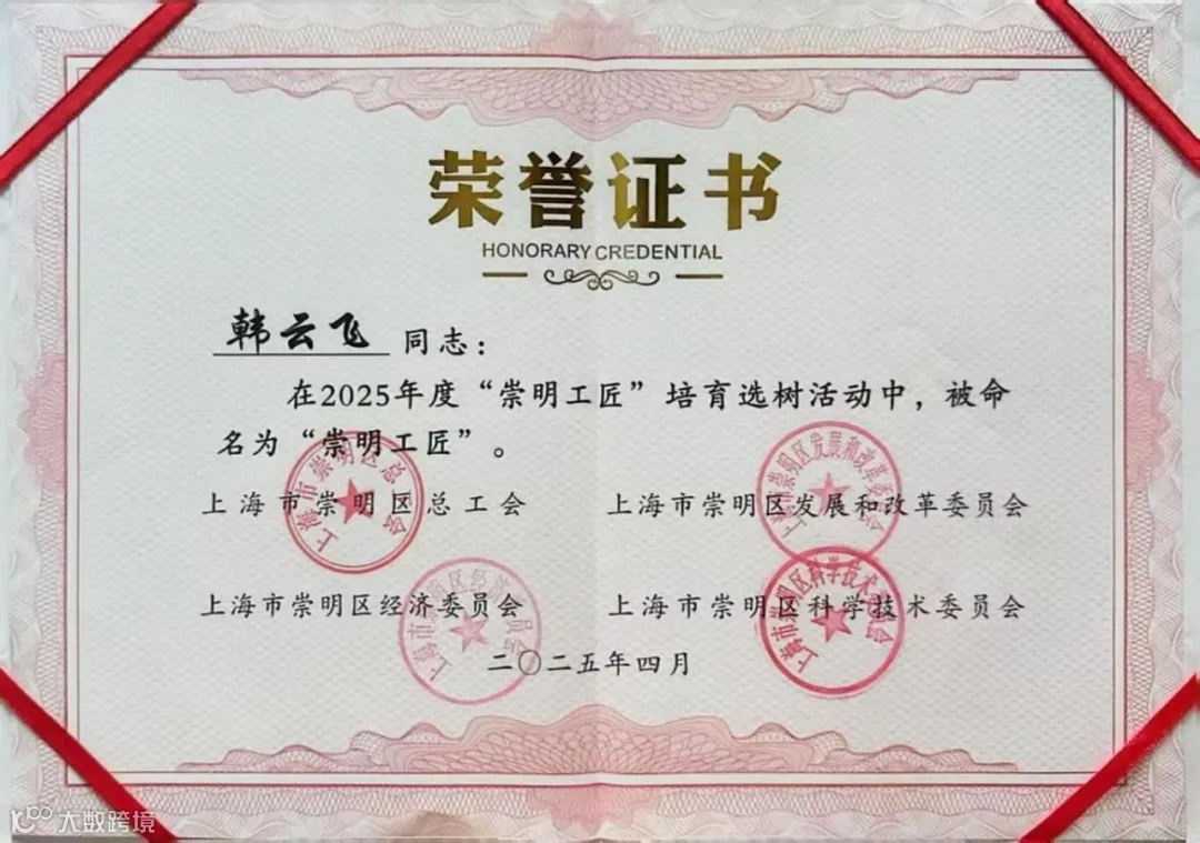 日前,在崇明区庆祝上海总工会成立100周年主题活动暨劳模先进事迹宣讲会上,公司制造一部电焊高级工韩云飞被授予2025年度“崇明工匠”称号。