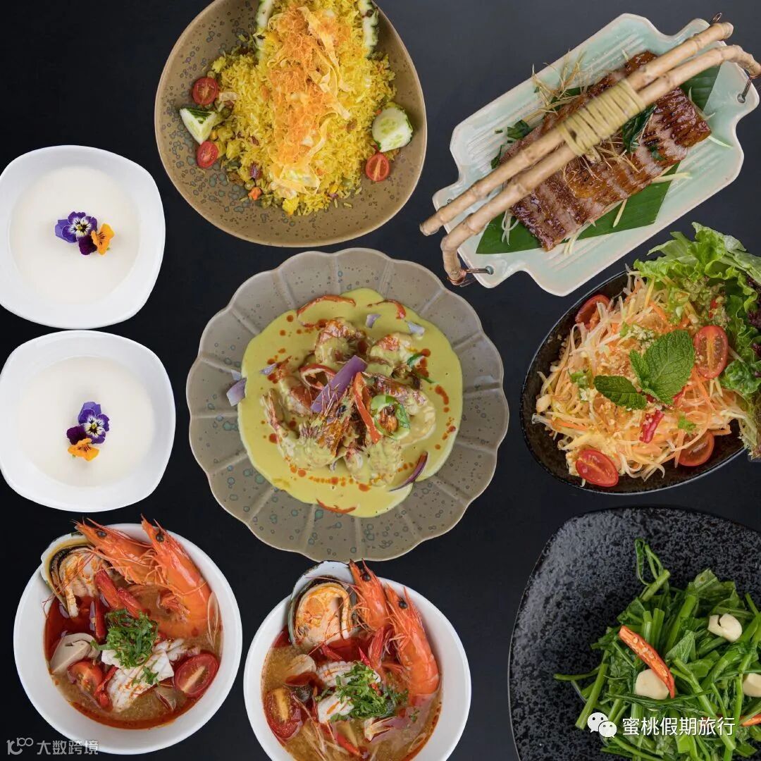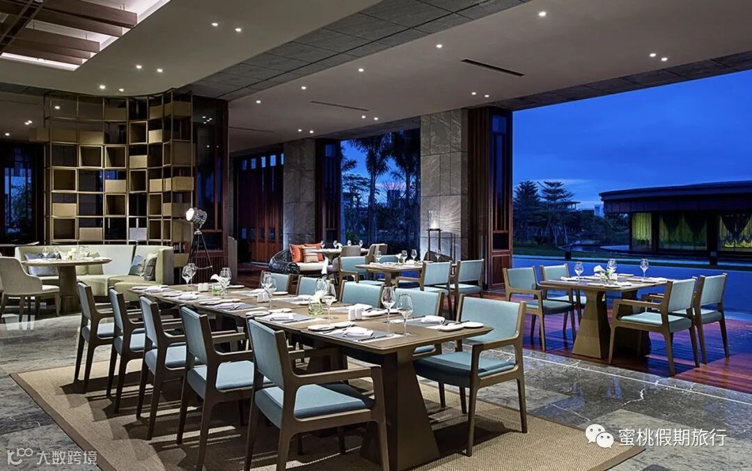 餐厅坐落于怡然幽静的酒店花园中心,临水而建,全透明的玻璃建筑主体以水景围绕;户外用餐区可欣赏园林美景和热带风情泳池