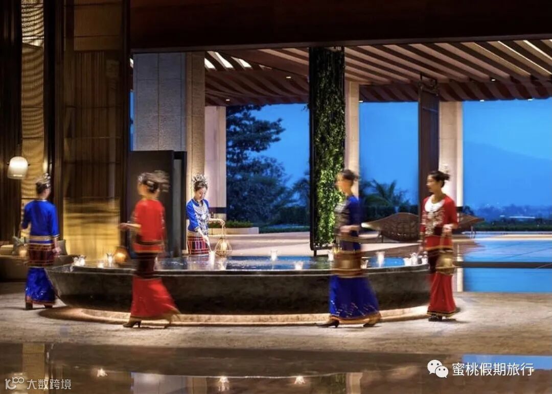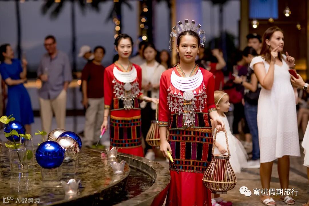 索菲特品牌特有的仪式,在三亚融入了当地民族特色风情,身着黎族服饰的男女使者,围绕着大堂中央的景观池旋转,并逐一将景观池与大堂的烛台点燃~