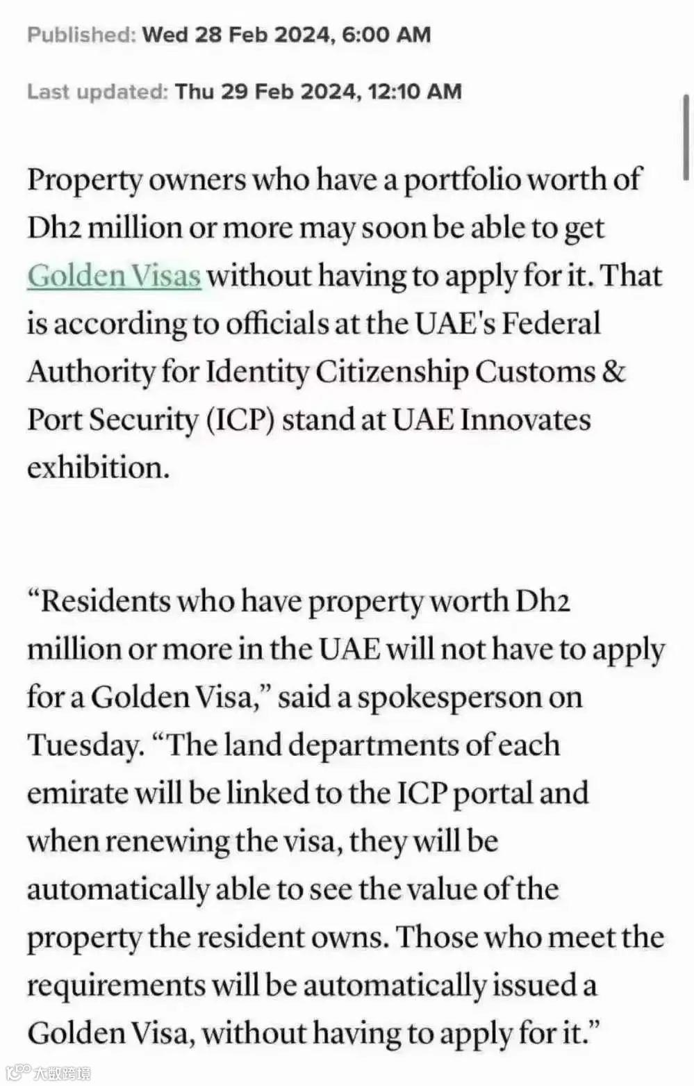 阿联酋联邦身份公民身份海关和港口安全局 (ICP) 官员在当地时间2月27日正式宣布:在阿联酋购买200万迪拉姆(约382万人民币)以上不动产的投资人,即将免去申请里流程,自动授予10年黄金签证。