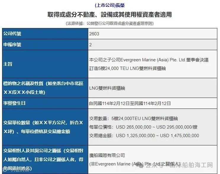 根据公告,长荣海运子公司Evergreen Marine董事会决议向韩华海洋订造6艘24000TEU LNG双燃料动力集装箱船,单船价格为2.65亿美元~2.95亿美元,交易总金额为15.9亿美元~17.7亿美元;长荣海运另一家子公司Evergreen Marine (Asia) Pte. Ltd.董事会决议则向中国船舶集团旗下广船国际订造5艘24000TEU LNG双燃料动力集装箱船,单船价格为2.65亿美元~2.95亿美元,交易总金额为13.25亿美元~14.75亿美元。