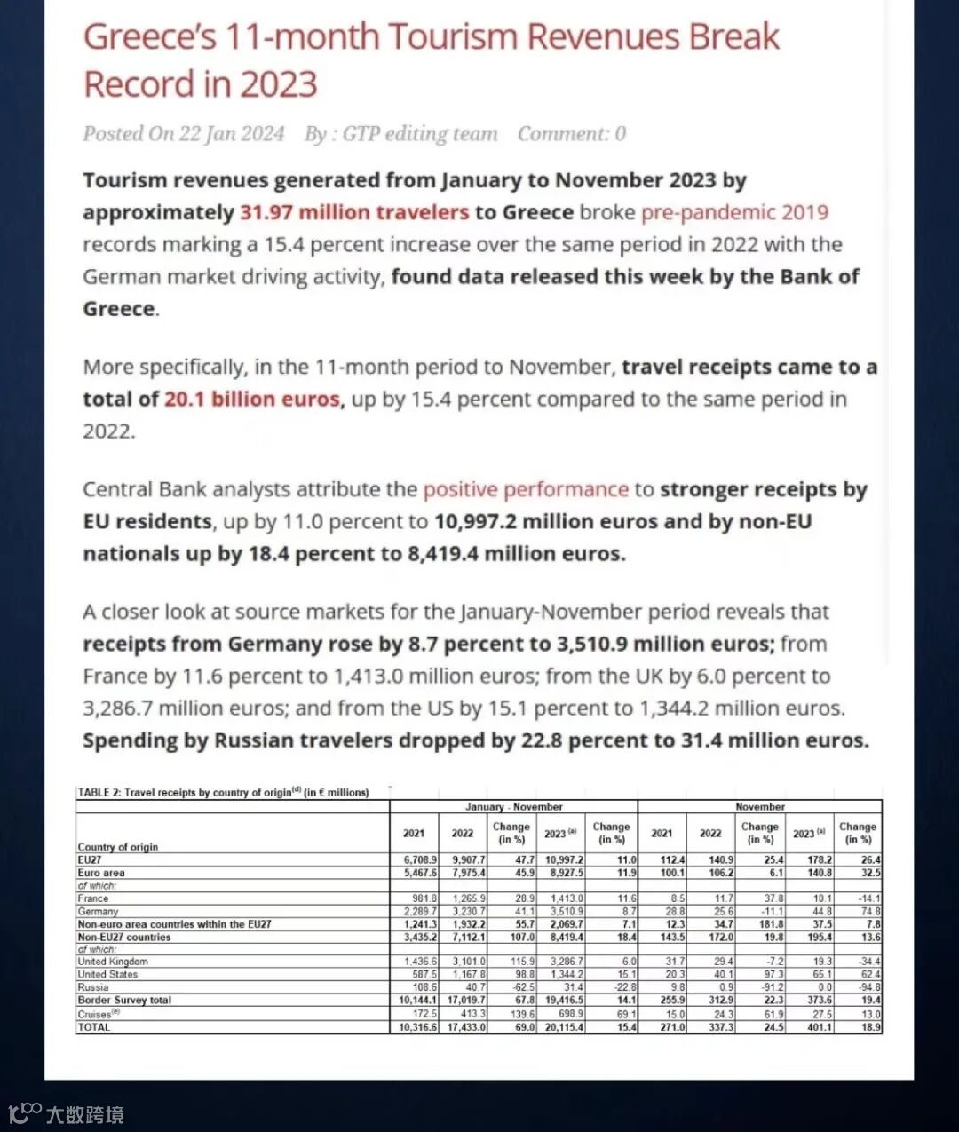自2023年年初以来,希腊黄金签证项目已经为希腊带来了13.2亿元的收入,预计2023年全年,该项目的总额将达到15亿欧元。