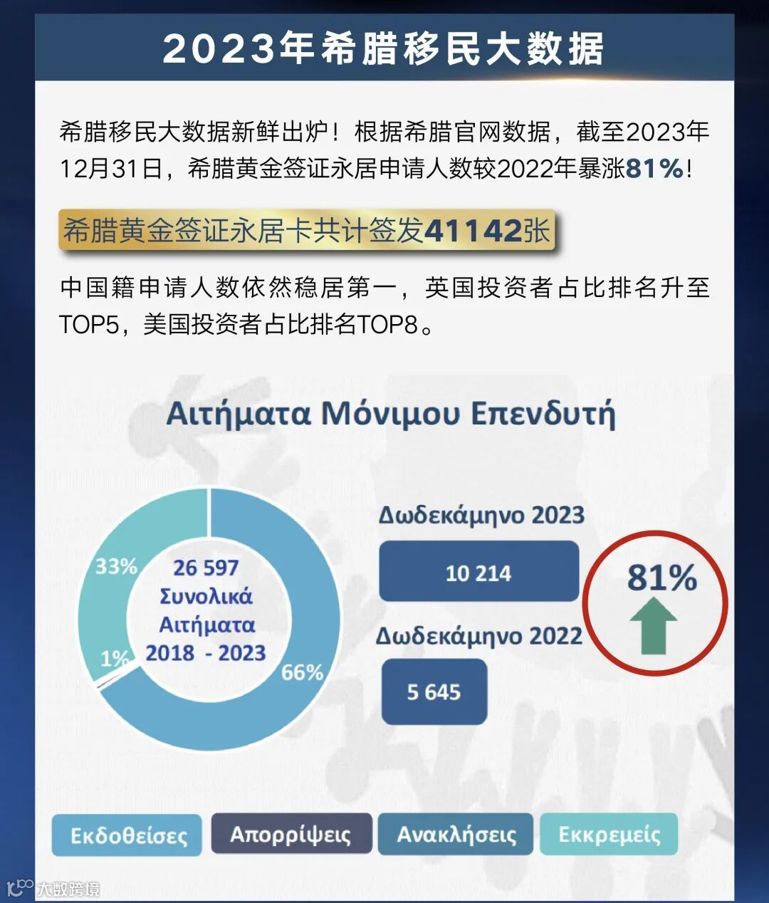 根据希腊官网数据统计,截至2023年12月31日,希腊永居卡的签发数量已达到41,142张,2023年首次申请人数较2022年上涨81%,中国籍申请者依然占据榜首,英国投资者占比排名升至TOP5,美国投资者占比排名TOP8。