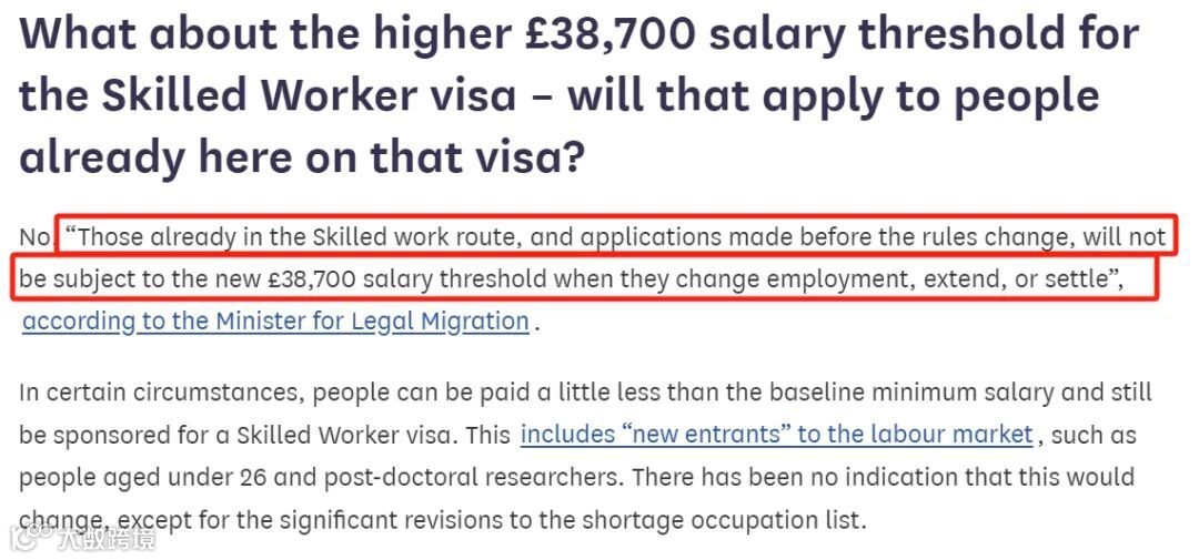 根据英国合法移民部长的说法, “那些已经处于技术工作路线并在规则更改之前提出申请的人,在更换工作、延期或定居时将不受新的38,700 英镑工资门槛的限制” 。