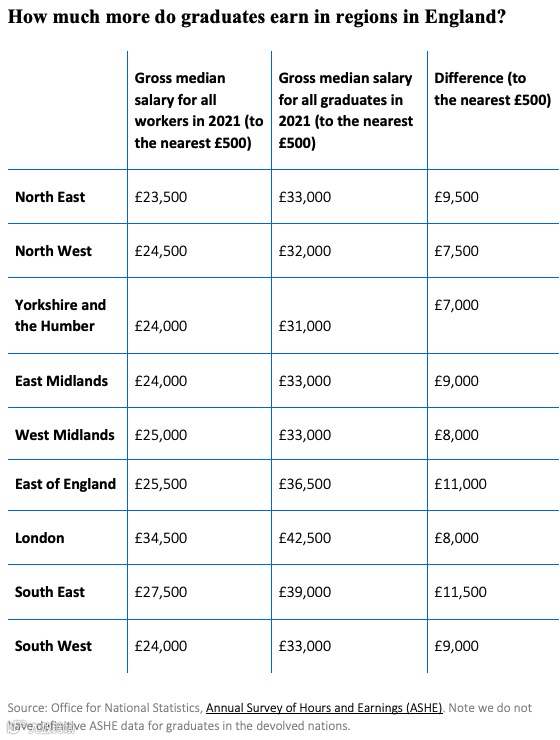 在英格兰地区,毕业生的平均薪资为 36,000 英镑,具体从东北部的 30,000 英镑到伦敦的 42,500 英镑不等。
