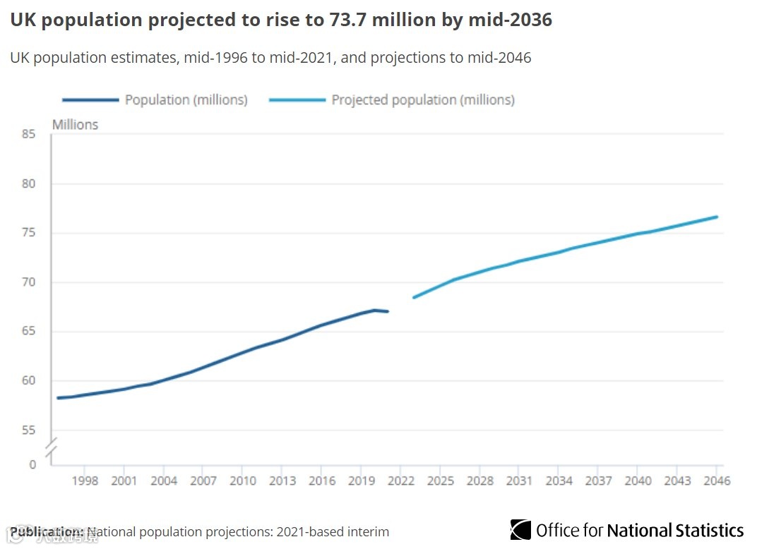 据英国国家统计局(ONS)的预测数据显示,2021年至2036年间,英国人口将增加660万(9.9%)。到2036年,英国人口在净移民的推动下可能达到近7400万,其中包括610万人的净移民和比死亡人数多出的约50万出生人数。