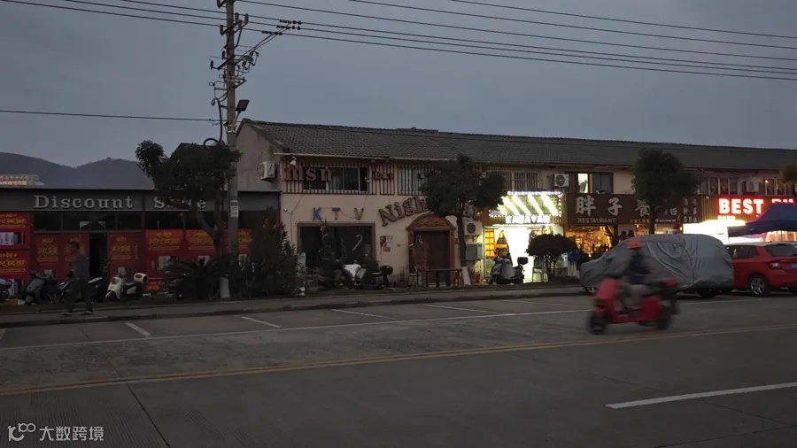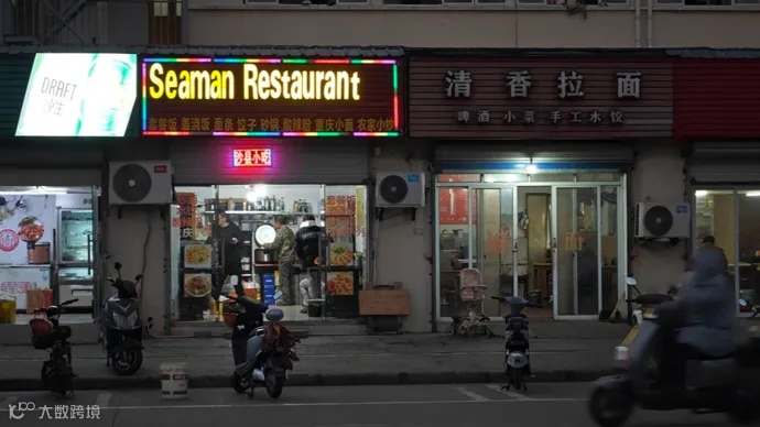 冬日,夜色渐浓,小干岛上万邦船舶重工(舟山)有限公司附近,下班的船工们鱼贯而出。从船厂到小干岛夜市的距离不到1公里,几乎每个路灯底下,都有摆摊的人群,用扩音喇叭高声吆喝叫卖。沿街的商铺业态丰富,从餐饮、百货到酒吧、KTV等娱乐设施,一应俱全。中英结合的店铺招牌颇具特色,点亮灯光后,英语店招更加显眼,清一色都与“seaman(海员)”有关。